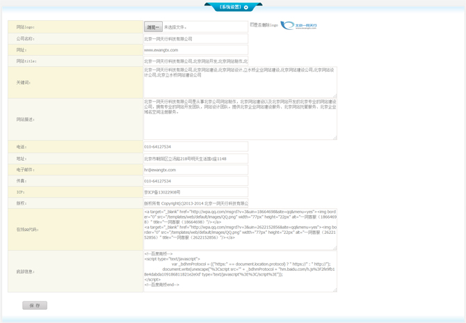 3、網(wǎng)站所有者信息設(shè)置(電話(huà)、地址、電子郵件、傳真、ICP、版權(quán)、在線(xiàn)QQ代碼、底部信息),這些內(nèi)容將在網(wǎng)站的固定位置進(jìn)行展示,宣傳公司信息!